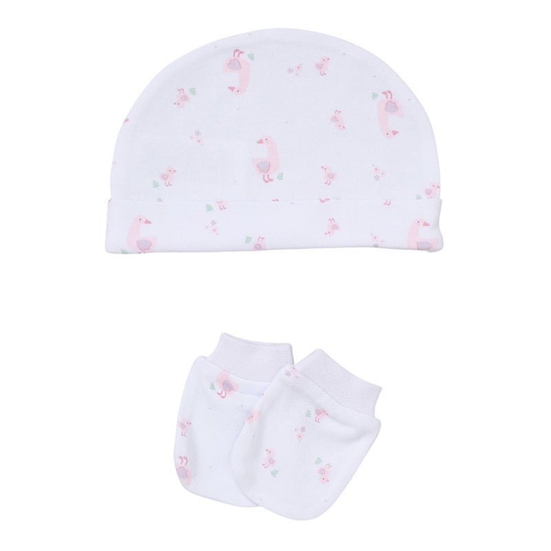 Babies pink duck bear 5pc set including the following: baby grow, hat, mittens, bib and baby vest. Complimentary gift bag is also provided.
