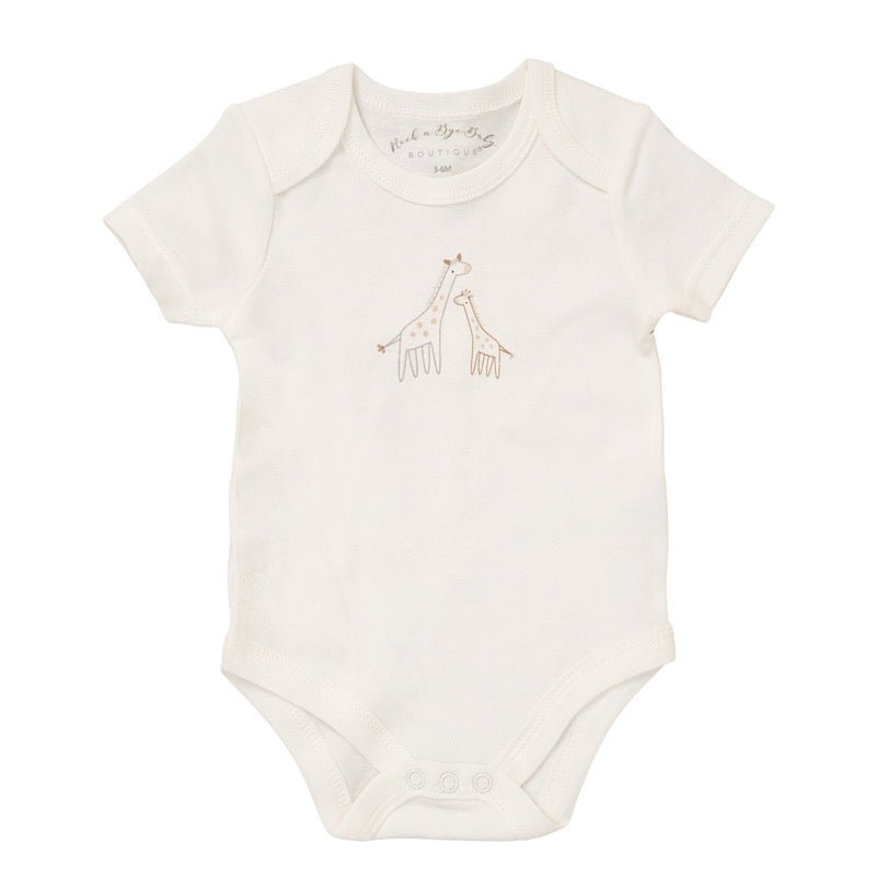 Babies giraffe print 5pc set including the following: baby grow, hat, mittens, bib and baby vest. Complimentary gift bag is also provided.