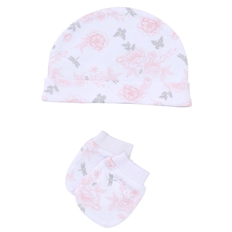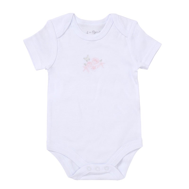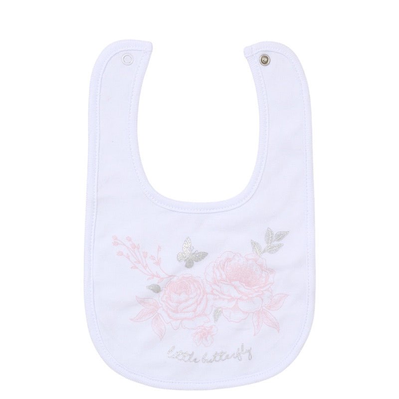 Babies ivory & pink little butterfly 5pc set including the following: baby grow, hat, mittens, bib and baby vest. Complimentary gift bag is also provided.