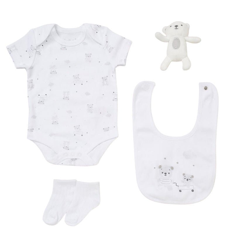 Baby 4pc box gift set including the following; Soft Toy, socks, popper fastening bib, envelope neck bodysuit.