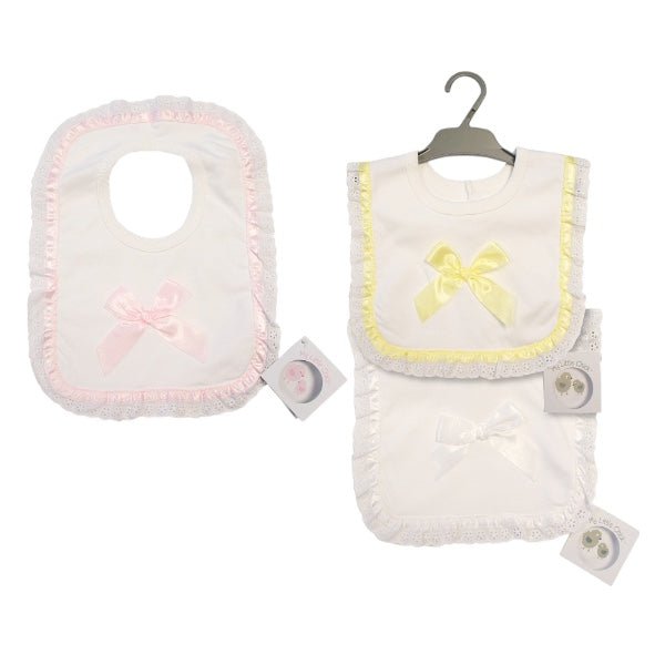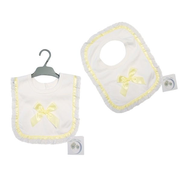 Baby Pop-Over Bibs with Lace Border and Bow are crafted from 100% pure cotton, ensuring softness and breathability ideal for delicate baby skin. Available in charming shades of pink, white, and lemon, these bibs measure 23×22 cm, providing ample coverage to protect your baby’s clothes during feeding. The elegant lace border and delicate bow add a touch of sophistication, making them perfect for both everyday use and special occasions. Designed for easy pop-over wear, these bibs combine practicality with style, offering comfort and convenience for parents and a gentle feel for babies.